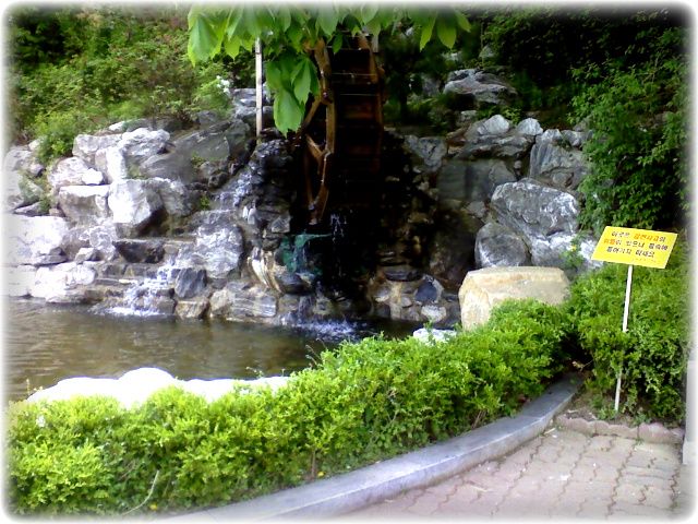 물레방아가 돌고 있는 작은 정원 같은 연못.