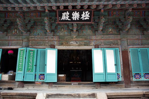 극락전은 다 봤으니 본전인 대웅전으로 넘어간다. 대웅전에서 창살 너머로 본 극락전.